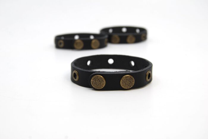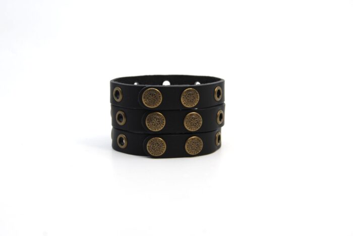Juodos spalvos odinė apyrankė dekoruota bronzinės akutėmis susegama dvejomis spaudėmis