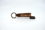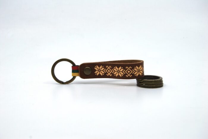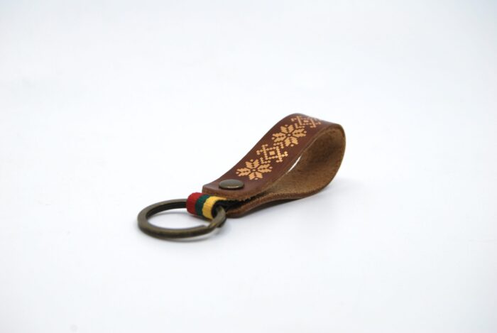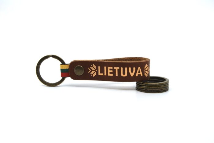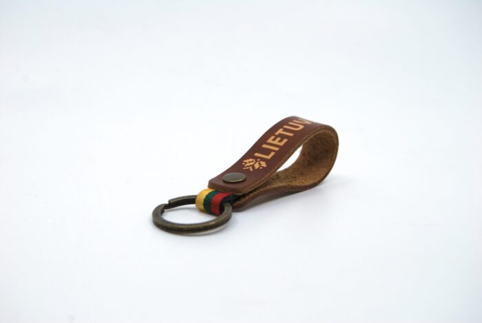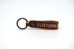 Odinis raktų pakabukas LIETUVA iš rudos odos ir aukso spalvos lietuviškais raštais